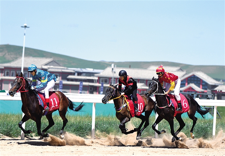 8月5日,骑手们在赛场上激情驰骋。当日,2023中华民族大赛马·和美乡村系列赛太仆寺旗站赛事在该旗贡宝拉格苏木盛装开赛。据了解,本次大赛设置了品种马速度赛、蒙古马耐力赛、马文化主题摄影等比赛,还设有马匹竞拍、篝火晚会等活动。本报记者 巴依斯古楞 摄