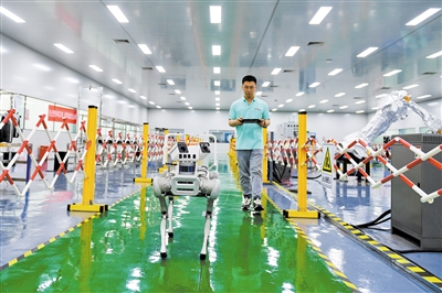 8月10日,内蒙古北科交大机器人有限公司的工作人员正在对行走式智能巡检机器狗进行安全测试。内蒙古北科交大机器人有限公司是一家以工业机器人为核心的数字化、智能化设备和系统解决方案产学研一体化的高科技企业,目前已在钢铁、铝业、稀土、风电、光伏等行业研发并广泛应用了多款机器人,助力相关产业高质量发展。本报记者 王晓博 摄