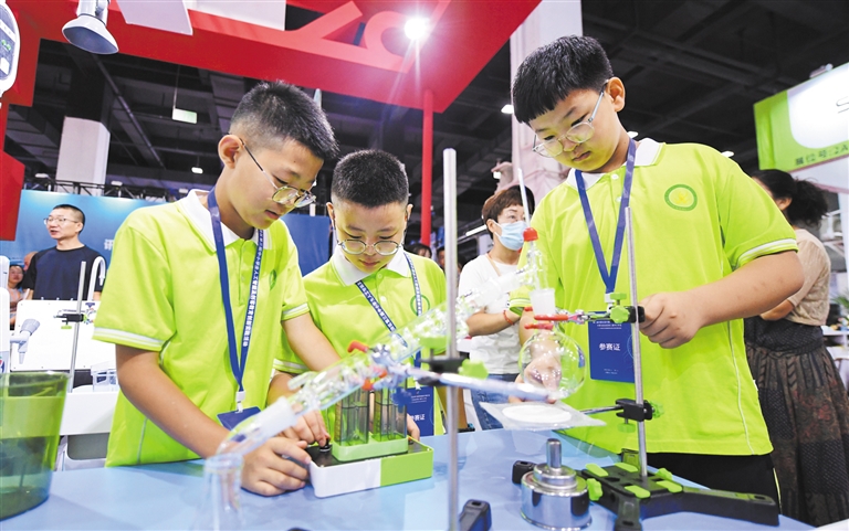 8月11日,小朋友们现场体验实验设备。当日,第二届内蒙古现代教育装备技术展示会在呼和浩特市开幕。本次教育装备展为期3天,以“推进教育数字化转型,助力教育高质量发展”为主题,遵循“双向展示,支持多主体多元交流”的融合办展模式,共吸引百余家企业参展,布展展位555个。本报记者 王磊 刘志贤 摄影报道