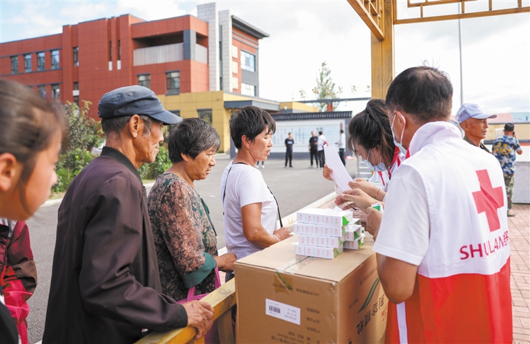 8月11日,居民在吉林省舒兰市舒兰三中居民安置点领取舒兰市红十字会发放的药品物资。为应对台风“卡努”带来的影响,吉林省舒兰市落实转移关停措施,确保危险区域群众应转尽转、应转必转、应转早转,全力保障人民群众生命安全。新华社记者 颜麟蕴 摄