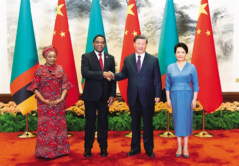 希奇莱马表示,赞方珍视由两国老一辈领导人亲手缔造的赞中友谊。中国发展带动全球南方国家取得进步,提升了全球南方国家在国际事务中的代表性和发言权,推动国际秩序朝着更加公正合理的方向发展。赞方感谢中方支持非盟加入二十国集团,感谢中方为解决赞债务问题发挥的积极作用。赞方恪守一个中国原则,高度赞赏中国式现代化的指导理念和原则,希望学习借鉴中国发展经验,愿同中方一道,以两国建立全面战略合作伙伴关系为契机,深化共建“一带一路”和矿业、农业、经贸、科技、基础设施建设、医疗卫生等领域合作,■下转第3版 ■上接第1版 实现优势互补、共同发展。中非合作论坛是推动非洲国家发展的重要平台,赞方感谢中方将于2024年举办论坛会议,愿同中方一道推动非中合作迈上新台阶,共同应对能源和粮食安全等全球性挑战,为世界注入更多稳定性。