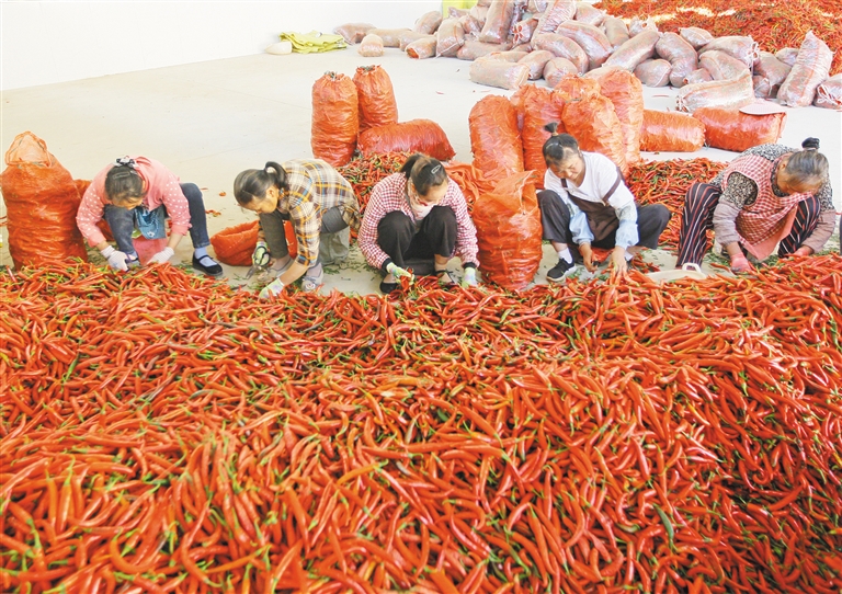 9月17日,在云南省曲靖市沾益区金龙街道新海社区的辣椒收购点,务工人员分拣辣椒。金秋时节,各地村民抢抓晴好天气收获、晾晒农作物。新华社发