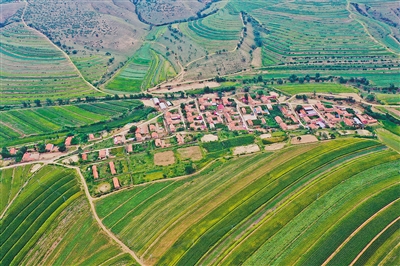金秋时节,航拍镜头下的赤峰市敖汉旗萨力巴乡三十二连山梯田美不胜收。三十二连山生态建设工程由32座山峰相连而成,总面积3.2万亩,是以水平梯田建设为主,山、水、田、林、路综合治理的典型。目前,三十二连山完成了水保造林1.7万亩,建设高标准水平梯田8020亩,农田防护林网30条、共2.5万米,打造敖汉旗生态修复基地1.5万亩,曾经沙尘滚滚的“不毛之地”变成了“片片绿洲”。本报记者 王晓博 摄
