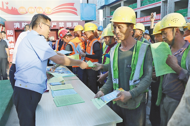 近日,呼和浩特市人力资源和社会保障局走进赛罕区万锦皓月项目施工现场,开展“薪暖农民工”宣传活动。活动通过宣传展板、广播介绍、发放宣传手册等多种形式,将保障劳动权益知识普及给农民工们,工作人员现场答疑解惑,针对个别情况做好登记工作,开展进一步帮扶解决。今年以来,呼和浩特市聚焦解决拖欠工资等侵害农民工劳动报酬权益问题,全面启动了“薪暖农民工”系列服务行动,助力农民工保“酬”护“薪”。见习记者 杨林枝 摄
