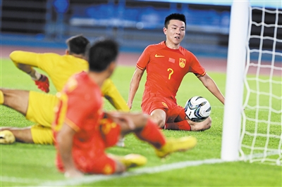 9月19日,中国队球员陶强龙(右)在比赛中射门得分。当日,在杭州亚运会男子足球小组赛A组首轮比赛中,中国队以5比1战胜印度队。 新华社记者 杜宇 摄