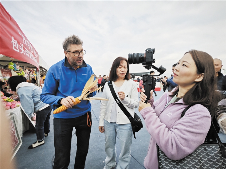 在包头市妇联巾帼好品展示区,当地妇女的手工编织品非常受关注,大家纷纷驻足了解玉米皮工艺品、坐垫、手提筐等。“这幅画非常漂亮,是用玉米皮做成的。”■下转第4版 ■上接第3版 来自英国的“网红”博主李·巴雷特认真听了介绍,并录制了短视频。现场,热情的村民纷纷与外国友人打招呼、聊天、合影留念。