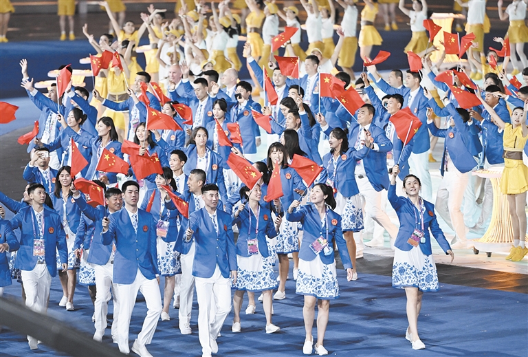 9月23日晚,第十九届亚洲运动会开幕式在浙江省杭州市隆重举行。开幕式文艺表演以“潮起亚细亚”为总主题,分为《国风雅韵》《钱塘潮涌》《携手同行》三大篇章,寓意着新时代的中国正与亚洲、世界交融激荡,像浪潮一样奔涌向前。开幕式首次将3D双威亚技术应用于大型运动场中,首次实现“数实融合”点火仪式。本次亚运会有来自亚洲45个国家和地区代表团的1.2万多名运动员报名参赛,共设40个大项、61个分项、481个小项,是史上规模最大、项目最多、覆盖面最广的一届亚运会。本报记者 孟和朝鲁 摄