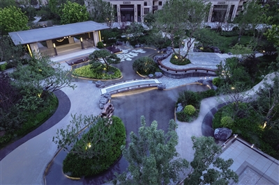 进入大门后,即是中海河山大观精心打造的景观园林区域,三进门院营造归家礼序,运用古代大门中等级高、空间阔的府门形制,山水画壁,迎宾步道、水聚弯桥,寓意招财聚气,让归家仪式感在不动声色中层层递进。同时,园区内种植了各类乔木以及国槐、红宝石海棠等名贵树种,让人身临自然之境,微风拂面,神清气爽,惬意无比。