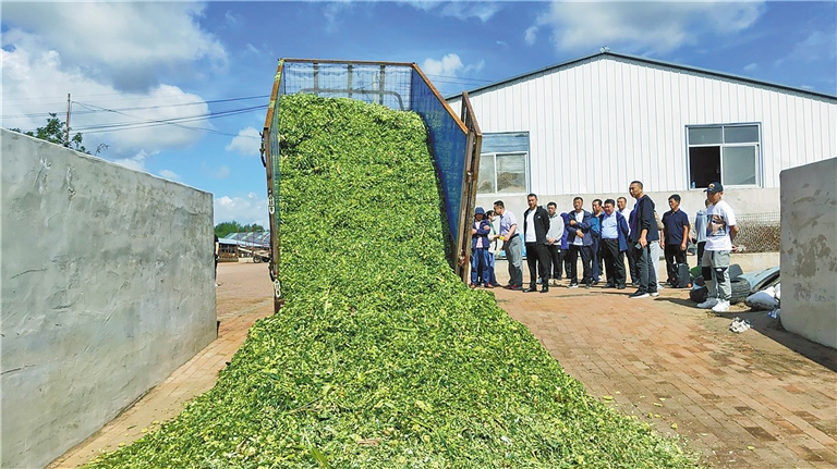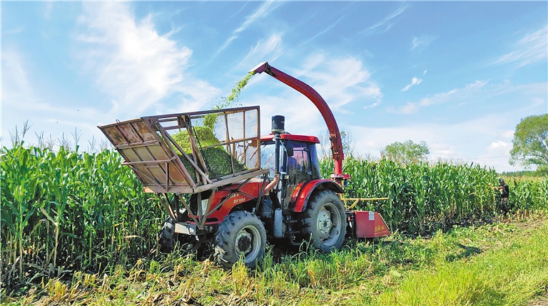 在甘旗卡镇北甘旗卡村王海成的农田里,记者看到,青贮饲料收割机正在田间来回穿梭,拖拉机同步跟随收割机配套作业,将新收割的玉米秸秆打磨、粉碎成青贮饲料。