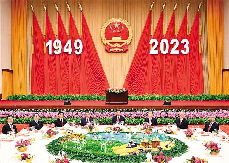 人民大会堂宴会厅华灯璀璨、鲜花绽放,洋溢着喜庆热烈的节日氛围。主席台上方高悬着庄严的国徽,“1949-2023”大字年号在鲜艳的红旗映衬下格外醒目。
