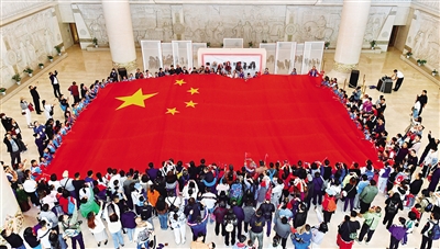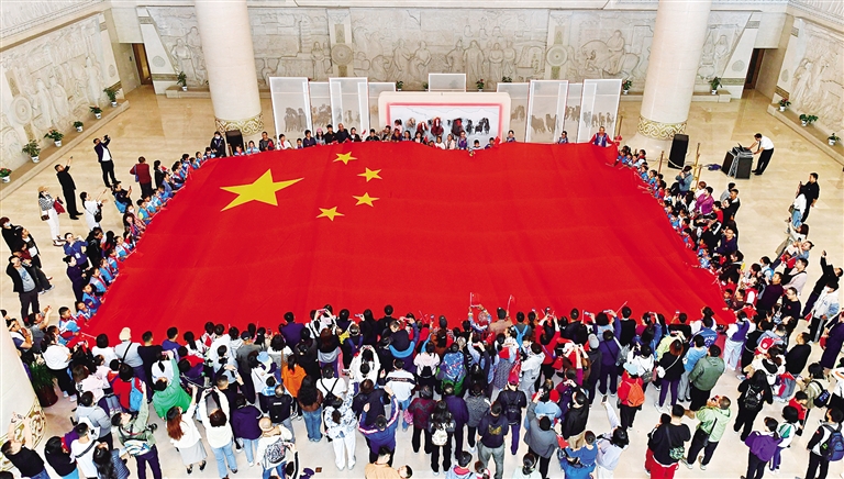10月1日,内蒙古博物院举办国庆快闪“五星红旗在我心,心手相连迎国庆”活动。来自全国各地的游客齐展巨幅国旗,共同高唱国歌,奋进新时代,携手奏华章。此项活动自2017年起至今日已举办7年,成为国庆期间内蒙古博物院最受观众欢迎的活动,满满仪式感,浓浓爱国情。 本报记者 王磊 摄