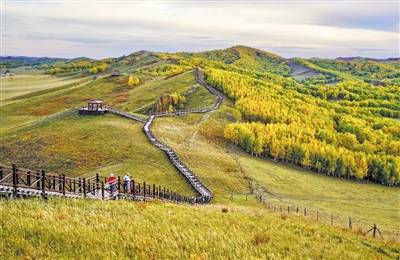 金秋时节,位于赤峰市克什克腾旗的乌兰布统景区风光旖旎,游客纷纷前来观光打卡。草原上散落的云杉、白桦等树种渐次变换颜色,层林尽染,色彩斑斓,宛若童话世界。