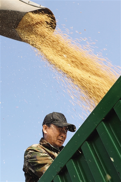 金秋十月,呼伦贝尔农垦大河湾农牧场有限公司的10万余亩大豆喜获丰收,一排排整齐的豆荚像一串串金黄色的“铃铛”,个个颗粒饱满。金豆摇铃,几台大型联合收割机来回穿梭,一垄垄的大豆卷进收割机,变成金灿灿的豆子,一派丰收的喜人场景。