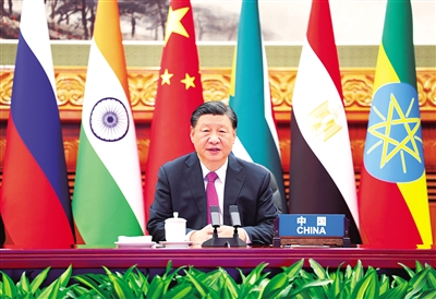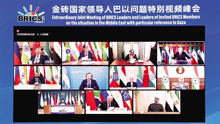 习近平强调,金砖合作机制是新兴市场国家和发展中国家加强团结合作、维护共同利益的重要平台。今天,我们就巴以问题协调立场、采取行动,为扩员后的“大金砖合作”开了个好头。中方愿同其他成员一道,开创金砖合作新时代。