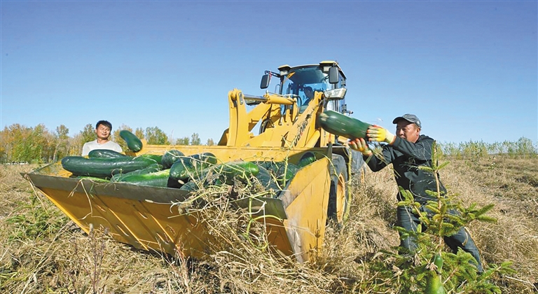近日,在赤峰市翁牛特旗白音套海苏木双河嘎查冬瓜回收现场,村民们争分夺秒地搬运、装车……今年,这里玉米套种冬瓜近600亩土地,迎来了“一地一季两丰收”。