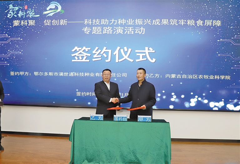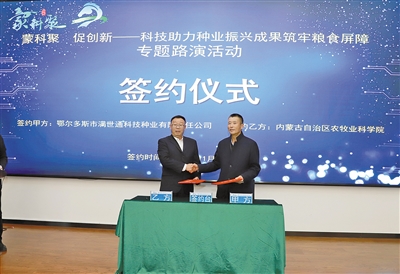活动中,赤峰市农牧科学研究所与内蒙古景琪种子科技有限公司、内蒙古农牧业科学院与鄂尔多斯市满世通科技种业有限责任公司、呼伦贝尔市中农种业有限公司分别围绕高粱、玉米等新品种生产经营开展进一步合作,签订了成果转化合作协议,签约转化总金额100万元。