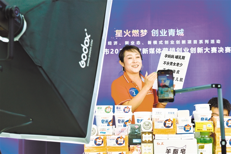 11月29日,选手在直播电商赛道比赛中展示产品。当天,呼和浩特市2023年“星火燃梦 创业青城”新媒体营销创业创新大赛决赛在呼和浩特人力资源服务产业园开赛。本次大赛共接到报名作品100余个,经过初筛、预赛,共有40个参赛作品进入决赛。比赛为首府创业创新人才搭建了项目展示和技术交流的良好平台,实现创新资源共享和优势互补,有效助力推动呼和浩特地区新媒体短视频、直播电商行业发展和进步。