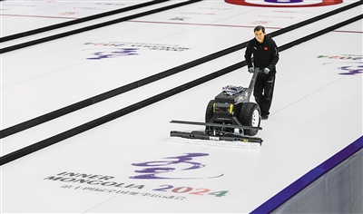 12月7日,走进位于呼伦贝尔市海拉尔区的内蒙古自治区冰上运动训练中心冰球冰壶馆,只见制冰师正在一遍又一遍地修整冰面,为即将到来的“十四冬”冰壶项目青年组比赛做准备。