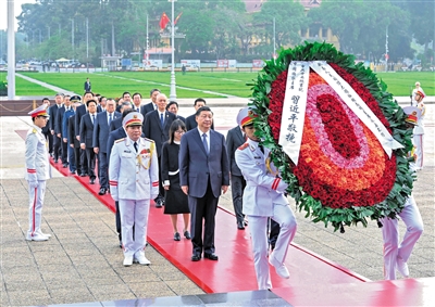 当地时间12月13日上午,中共中央总书记、国家主席习近平在河内瞻仰胡志明陵并敬献花圈。