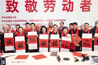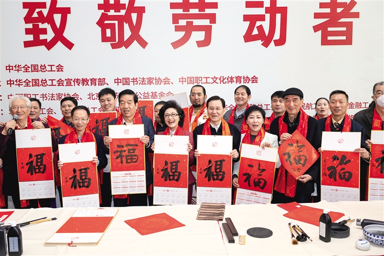 1月16日,在北京的中国职工之家举行的万福迎春——2024年“送万福、进万家”书法公益活动上,劳模与职工代表们展示书法家们写的福字。1月16日,由全国总工会指导,全国总工会宣传教育部、中国书法家协会主办的万福迎春——2024年“送万福、进万家”书法公益活动在北京举办首场示范活动——“致敬劳动者”专场,出席活动的多位书法家挥毫泼墨,为劳模工匠代表和一线职工书写春联和福字,表达新年问候与祝福。“送万福、进万家”书法公益活动已连续举办10年,成为深受群众喜爱的职工文化品牌。 新华社记者 才扬 摄