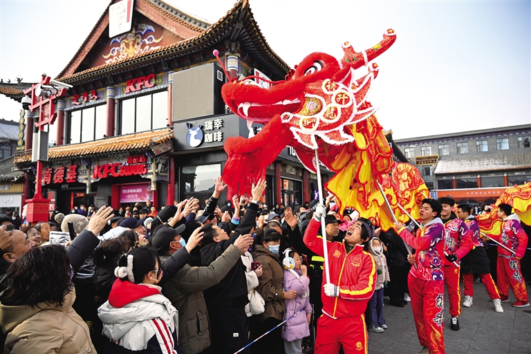 2月24日,舞龙艺人在呼和浩特市玉泉区塞上老街旅游休闲街区与游人共舞。农历正月十五元宵节,“龙腾狮跃闹元宵”民俗展演活动在呼和浩特市举行,吸引众多市民游客在丰富多彩的民俗活动中感受祥和喜庆的节日氛围。 本报记者 王磊 庄圆 摄