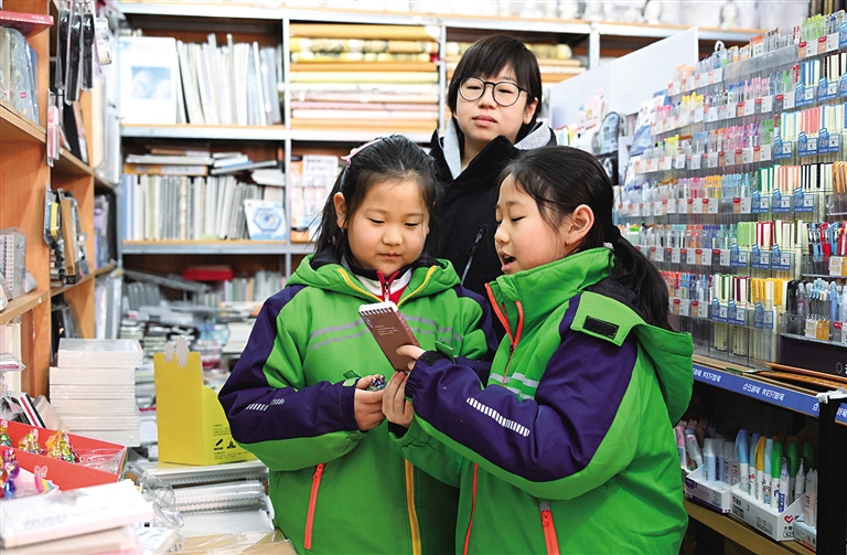 2月23日,呼和浩特市的小学生和家长一起在文化商城内购买文具。随着中小学开学时间的临近,书包、文具、图书等纷纷进入热销阶段,前来购买“开学装备”的学生和家长络绎不绝。本报记者  王磊  摄