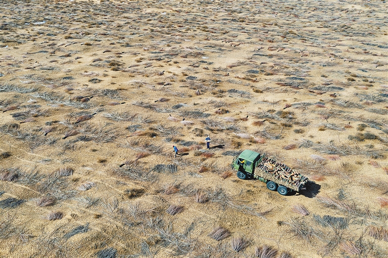 近日,鄂尔多斯市达拉特旗官井村的村民正在对沙柳林进行轮流平茬、装车。每年3月初到4月中旬,官井村进入了忙碌的沙柳收割季。官井村位于库布其沙漠边缘,当地群众从20世纪90年代起开始种植沙柳、保护家园,让茫茫沙海披绿生金。本报记者 王晓博 摄