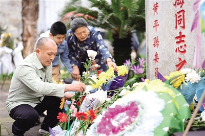 4月4日,石正祥(左)在贵州省黄平县旧州革命烈士陵园与烈属一起祭奠烈士。 当日是清明节,在贵州省黔东南苗族侗族自治州黄平县旧州镇东门村,62岁的石正祥把烈士陵园打扫得干干净净,以迎接前来缅怀和祭奠先烈的人们。 1985年,黄平县政府为王富海等烈士修缮了陵园。当时,石正祥的父亲石国民主动承担起为烈士守陵的义务。3年后,石国民弥留之际希望石正祥继承父志,继续为烈士守陵。接过守陵“接力棒”的石正祥牢记父亲嘱托,年复一年、风雨无阻地守护烈士陵园。石家两代人为烈士守陵已超过39载。2021年9月,石正祥入选中央文明办发布的“中国好人榜”。 新华社记者 杨楹 摄