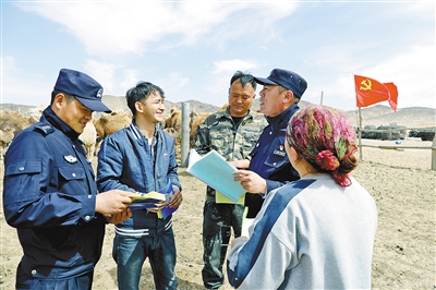 近日,阿拉善盟阿拉善右旗公安局巴丹吉林派出所党员民警服务队深入辖区开展“送安全宣传服务”活动。队员们以案说法,讲解防范电诈、禁毒拒赌、防火防盗安全知识,深受牧民群众欢迎,进一步密切了警民关系。本报记者 陈春艳 通讯员 石斌 摄
