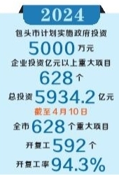统计显示,今年,包头市计划实施政府投资5000万元、企业投资亿元以上重大项目628个,总投资5934.2亿元。其中,续建项目219个,总投资2472.2亿元;新建项目409个,总投资3462亿元。截至4月10日,全市628个重大项目开复工592个,开复工率94.3%