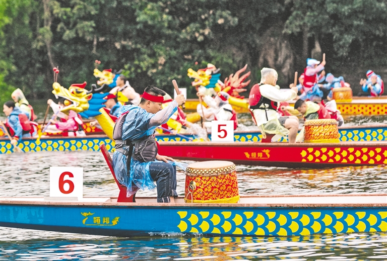 6月8日,在重庆市南川区黎香湖镇,参赛选手在成渝双城亲子龙舟赛上进行角逐。端午假期,各地举行龙舟比赛,迎接传统节日的到来。 新华社发