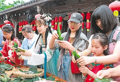 6月8日,游客在四川省成都市彭州市海窝子古镇体验包粽子。端午小长假期间,人们在多姿多彩的活动中尽情享受假日。 新华社发