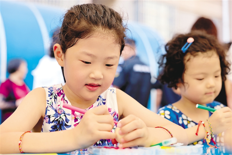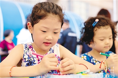 6月9日,在山东省枣庄市文化路街道市府社区,小朋友在参加画彩蛋比赛。 新华社发