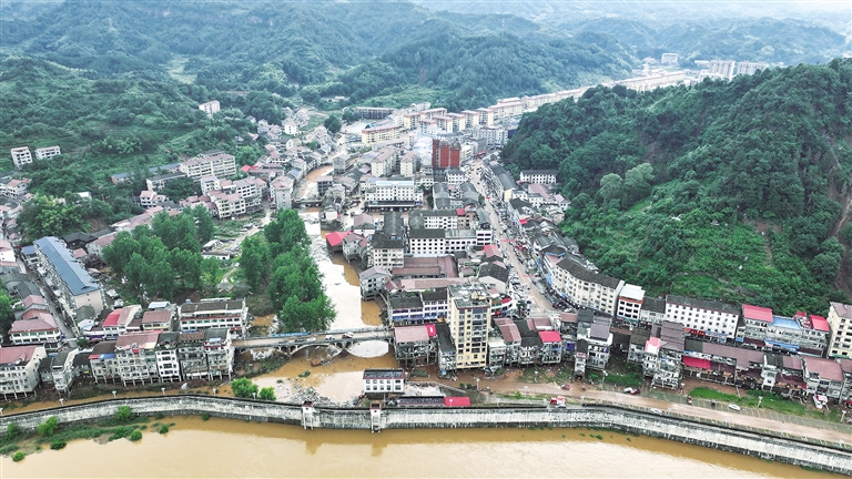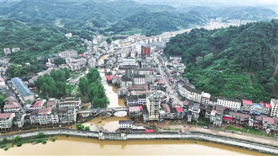 遭遇极端强降雨天气的沅陵县五强溪镇(6月23日摄,无人机照片)。6月22日,湖南省沅陵县五强溪镇遭遇极端强降雨天气,引发五强溪镇辖区内河流万洋溪发生山洪,在集镇形成严重内涝。目前,当地正积极开展抗洪救灾,争取将损失降到最低。 新华社发