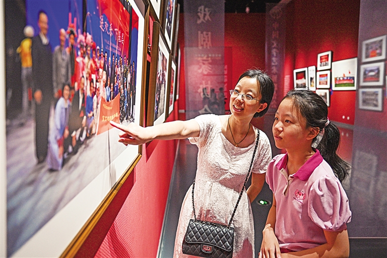 7月23日,观众在内蒙古美术馆参观主题摄影展。7月21日至8月14日,为庆祝新中国成立75周年,由中国文学艺术界联合会主办的“十年耕耘 繁花竞放”中国文联“深入生活、扎根人民”主题摄影展在内蒙古美术馆展出。本次展览共展出200余幅摄影作品,作品以光影的形式记录和展现各级文联组织带领广大文艺工作者勇攀文艺高峰的发展历程。本报记者 王磊 摄