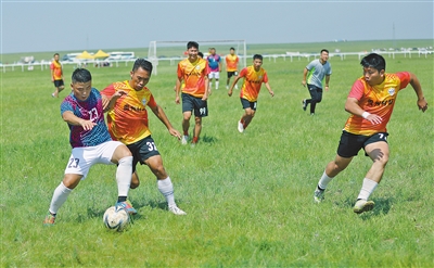 贵州省黔东南苗族侗族自治州榕江县罗汉果足球队与呼伦贝尔市新右旗西旗羊肉足球队友谊赛激烈进行中。本报记者 李新军 摄
