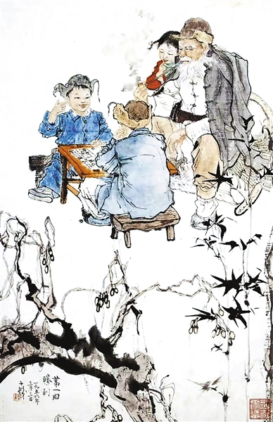 程十发于1958年创作的《第一回胜利》呈现的是冬天两个小男孩儿在院外下棋,其中一位“常败将军”竟然取得胜利的画面。但见那赢了的男孩儿笑呵呵地举起右手,伸出大拇指,很是得意;再看败了的男孩儿,左手托着腮帮,若有所思,似乎还沉浸在棋局之中,不明白自己是怎么输的。画作不仅描绘了当局者,而且增设了旁观者,那两位兴许是赢者的爷爷和妹妹吧。爷爷边吸着长烟锅边微笑着,或者心里在称赞他的孙子赢得巧妙,或者他早看出了棋局的走势,只不过不一语道破天机罢了。妹妹则趴在爷爷的右肩膀上,右手点着嘴唇,脸上露出了庆幸的笑容。4人中有3人为胜利而高兴,可见第一次胜利的难能可贵。画作重在体现传统游戏给孩子们带来的喜悦和乐趣,这无疑有益于他们身心的健康发展。