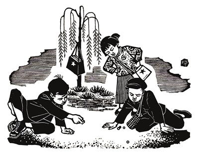 再说传统游戏画。李桦于1960年创作的版画《放学后》表现的是放学后孩子们把书包挂在树上或脖子上,急不可耐、全神贯注地投入打弹子游戏的场景。两个孩子专注的神情吸引来一位女同学的观看。观者这一人物的设置不是无意的,她代表了大多数儿童对游戏的渴望。画作不以“打弹子”为题,反以“放学后”为题,可谓另有深意。陈履生先生说:“李桦带有装饰性的艺术语言生动地表现了儿童的天性,而这与当时其他表现儿童放学后去参加劳动的作品有很大的不同。”由此可见,李桦创作此画的目的是还儿童自由,还儿童放学后玩乐的权利。作品有意突出儿童玩耍时专注的样子,目的是让读者了解儿童对益智游戏的热爱与向往。儿童喜欢玩游戏,这是他们的天性,是世界上最宝贵的东西。我们要尊重、保护儿童的天性和选择,引导他们向上向善,而不是放纵,更不是压迫和强制。就此而言,扼杀儿童的天性就是在扼杀他们的想象力和创造力,就是在阻碍他们成长。