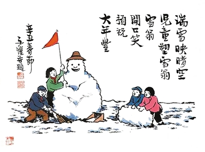 丰子恺于1961年创作的《瑞雪映晴空 儿童塑雪翁》,画面描绘的是雪后孩子们两两一组争先滚雪球、堆雪人的场景。其中一组率先塑造出一个形象逼真且面带微笑的“雪翁”,一个小女孩在“雪翁”旁双手高举红旗,以示喜悦的心情,另一个小男孩则在打扫“雪翁”周围的残雪。另外一组边滚雪球边看着他们的成果,投去满是羡慕的目光。尽管这组慢了些,但他们依然在努力着。这幅画的点睛之笔是丰子恺的题字,曰:“瑞雪映晴空,儿童塑雪翁。雪翁开口笑,预祝大年丰。”联系1961年发生的事情,可知画家托物言志,借童心喻民心,希望年丰、人安、国强盛。画家以足够的耐心和细腻的感情描绘孩子们在塑“雪翁”时的种种表现,由此可以想象出他们是热爱生活、积极向上的,在当时那种艰苦的环境下孩子们尚能如此,其他人自不必说。