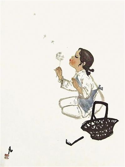 先说自然玩乐画。吴凡于1959年创作了版画《蒲公英》,画中一个小女孩坐在地上,手持一朵蒲公英放在嘴边缓缓地吹着,享受着蒲公英飞舞带来的乐趣。她的身边放着空篮子和镰刀,也许是刚刚劳动完便忘我地投入自然之中。画家把人物专注于吹蒲公英的神态刻画得逼真生动、形象传神,突出了人与自然的和谐,饱含童趣。我们可以从这幅作品中感受到一种纯净、朴素的心态和内在的精神力量。