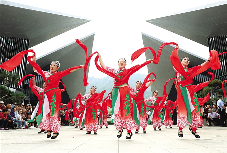 9月17日,在河北省石家庄市平山县光禄山风景区,当地群众为游客表演秧歌。9月18日,文化和旅游部发布数据显示,2024年中秋节假期,全国文化和旅游市场总体平稳有序,全国国内出游1.07亿人次,按可比口径较2019年同期增长6.3%;国内游客出游总花费510.47亿元,较2019年同期增长8.0%。 新华社发
