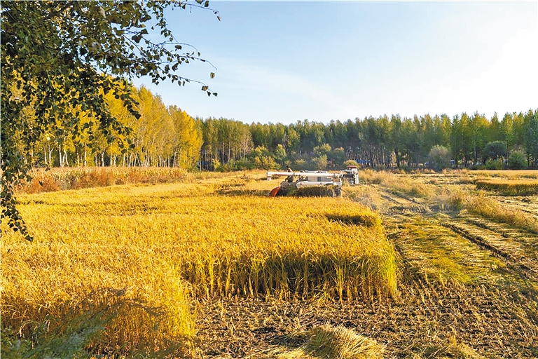 这几天,突泉县2万亩水稻也进入收割期,在金柱家庭农场盐碱地改造田里,工人抢抓晴好天气,加紧收割,确保成熟一片、收割一片、颗粒归仓。