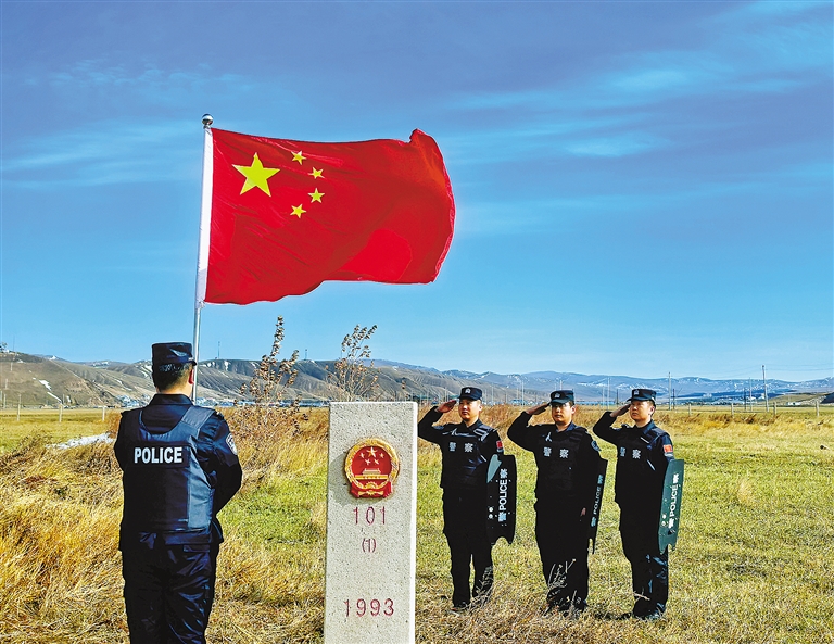 10月7日,呼伦贝尔边境管理支队恩和边境派出所开展“走边关、担使命、筑忠诚”主题党日活动,组织民警对101界碑附近地段进行巡逻踏查。民警们在界碑前面向国旗敬礼,并对界碑进行了描红。李永建 摄