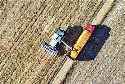 10月19日,在通辽市开鲁县小街基镇明升村,农机手驾驶收割机将玉米装进卡车(无人机照片)。通辽市地处“黄金玉米带”,今年玉米种植面积达1900余万亩。得益于浅埋滴灌、密植高产、一喷多促等技术手段的推广运用,通辽玉米迎来丰收季。 新华社发