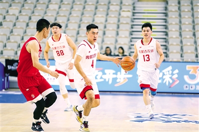 10月20日,内蒙古农信队球员(白)在比赛中带球突破。当日,由内蒙古自治区体育局主办,内蒙古篮球协会承办的2024年内蒙古自治区男子篮球联赛(蒙BA)季后赛在内蒙古体育馆正式开赛。内蒙古农信队、巴彦淖尔队、鄂尔多斯队、呼伦贝尔队、锡林郭勒队、兴泰集团队、呼和浩特队、乌兰察布队8支球队进入季后赛。在当日进行的首场比赛中,内蒙古农信队以79:61战胜巴彦淖尔队,率先闯进4强。本报记者 孟和朝鲁 摄