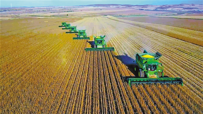 在呼伦贝尔市莫力达瓦达斡尔族自治旗522万亩大豆田里,大型联合收割机在田间穿梭,伴随着隆隆的机械轰鸣声,切割、脱粒、粉碎等作业一气呵成,处处洋溢着丰收的喜悦。