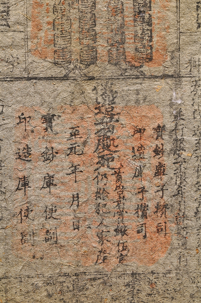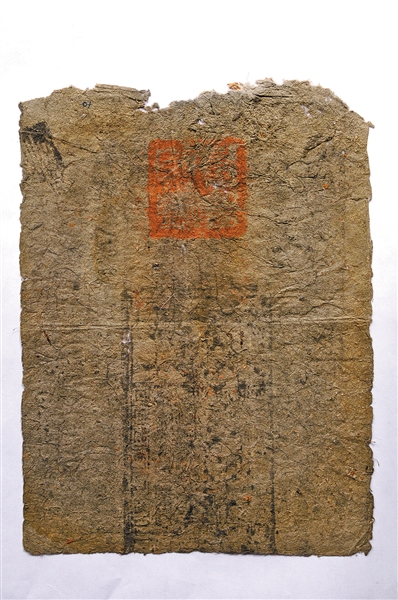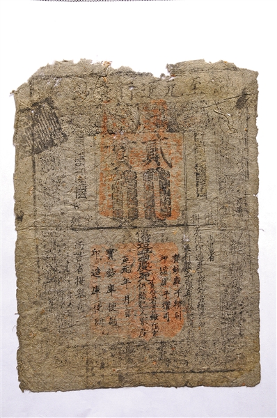 阿拉善博物馆“大漠胡杨·北疆热土——阿拉善通史陈列展”展厅,就珍藏着一张“至元通行宝钞贰贯”纸钞。该纸钞1990年被一位牧民在黑城遗址附近发现后,由额济纳旗文管所收藏。1992年8月,阿拉善盟文物站征调了“至元通行宝钞贰贯”纸钞,由阿拉善博物馆收藏。2004年10月21日,这张纸钞作为黑城遗址出土的中国早期货币实物标本,由内蒙古文物鉴定委员会鉴定为一级文物。