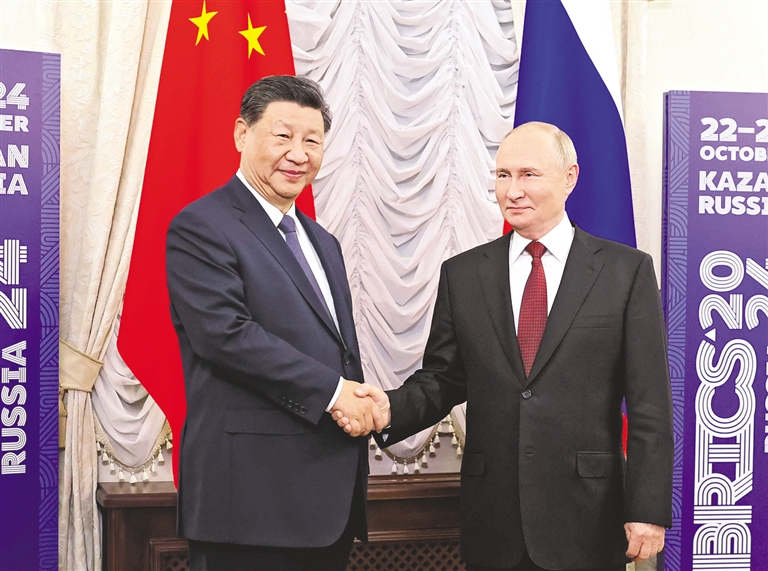 普京表示,不久前,我们共同庆祝俄中建交75周年。75年来,俄中已经发展成为新时代全面战略协作伙伴,■下转第4版 ■上接第1版 两国关系保持高水平发展,树立了新型大国关系的典范。俄中合作基于平等、相互尊重和互利互惠。在双方共同努力下,目前两国各领域务实合作持续推进,俄中文化年各项活动顺利举办。俄方希望同中方进一步深化合作,助力两国发展振兴。明年是第二次世界大战结束80周年。俄中为世界反法西斯战争胜利付出了巨大牺牲,俄方愿同中方共同纪念这一重要时间节点。俄方愿同中方继续保持密切高层交往以及在国际事务中的战略沟通协作,共同维护国际公平正义和全球战略稳定。感谢中方在俄方担任金砖国家主席国期间提供有力支持,俄方愿同中方密切配合,确保金砖扩员后首次领导人会晤取得成功,推动“大金砖合作”不断取得积极成果。