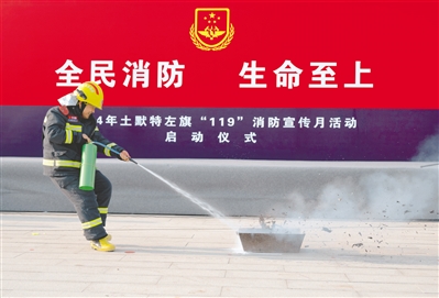 11月8日,在呼和浩特市伊利现代智慧健康谷,土默特左旗消防救援大队组织市民参与体验灭火器使用。当日,“全民消防 生命至上”2024年土默特左旗“119”消防安全宣传月正式启动。2024年11月是第33个“119”消防宣传月。连日来,围绕“全民消防 生命至上”主题,内蒙古消防救援总队部署辖区所属各单位,开展了形式多样的消防安全主题活动,为经济社会发展筑牢安全防线。本报记者 怀特乌勒斯 摄