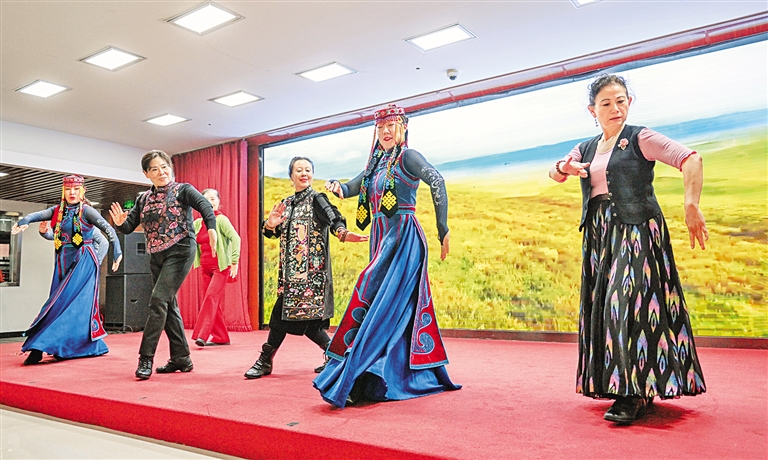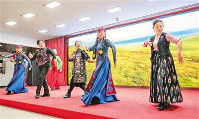 11月12日,乌兰牧骑队员在北京市西城区德胜街道办事处与群众一同跳舞。当日,内蒙古自治区直属乌兰牧骑携包头市达茂旗乌兰牧骑、鄂尔多斯市伊金霍洛旗乌兰牧骑开展“红色文艺轻骑兵 乌兰牧骑在北京”——北疆文化神州行文艺演出活动。据了解,此次乌兰牧骑进京演出活动,从11月6日至17日,在北京的民族文化宫为观众奉献33场精彩的演出,同时还将走进社区和学校开展多场演出活动。 本报记者 王磊 摄